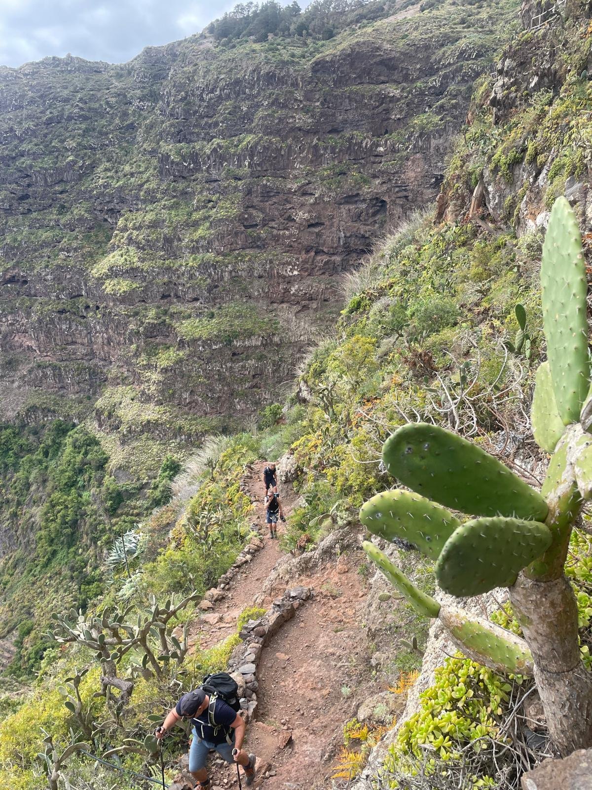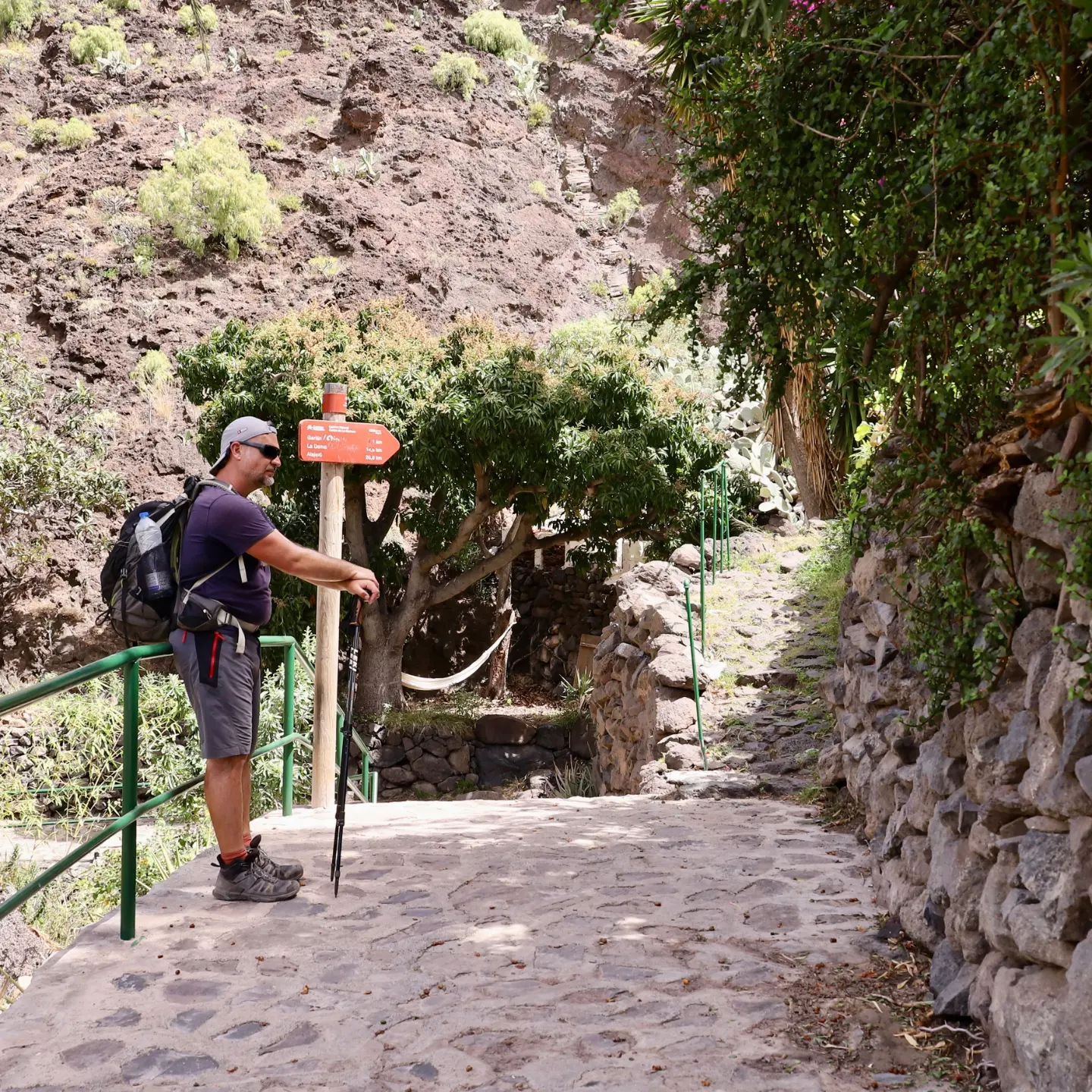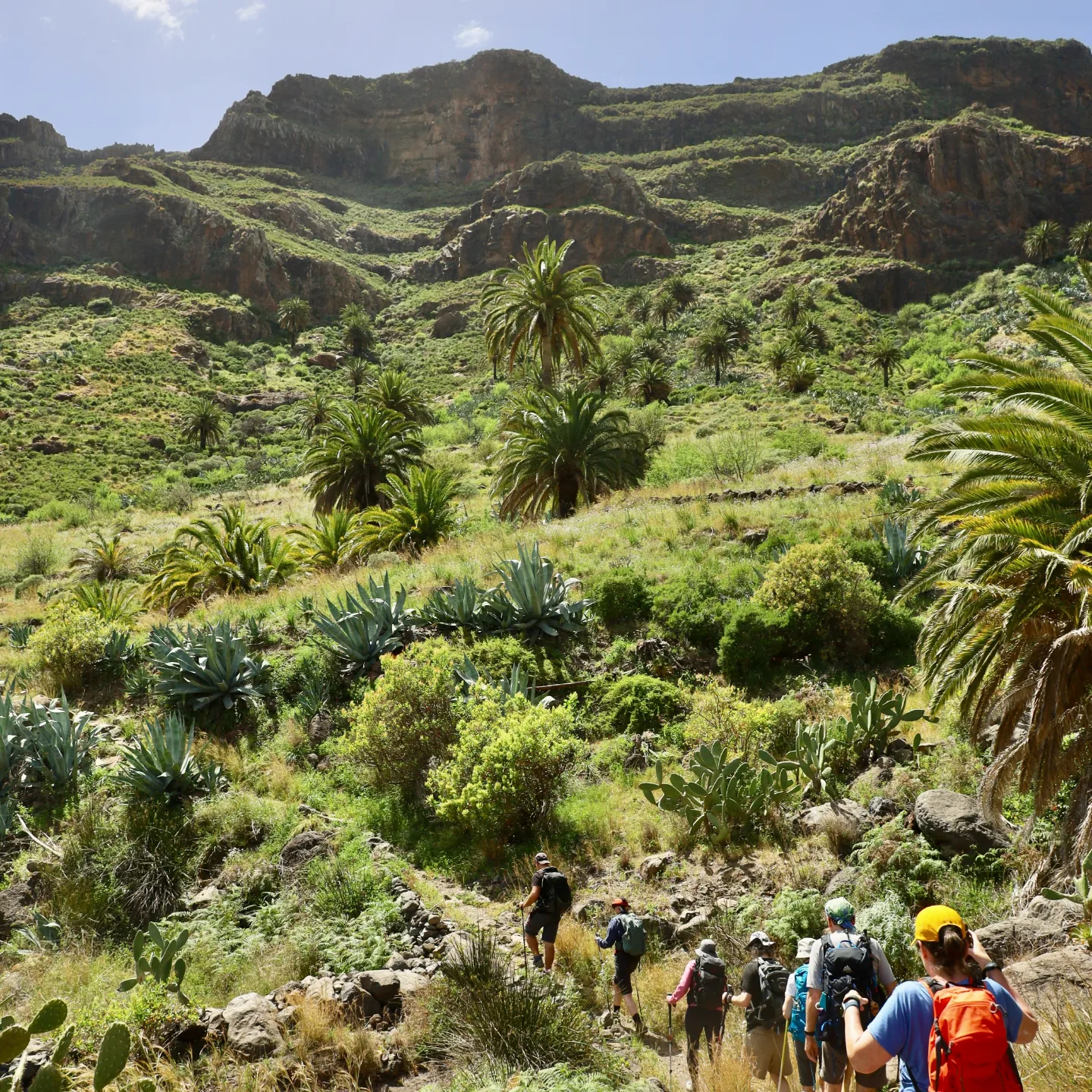 La caminata es circular, subiendo por el Barranco de Benchijigua y bajando por Guarimiar, mostrando el trabajo de la erosión en más de 2 millones de años sin actividad volcánica.